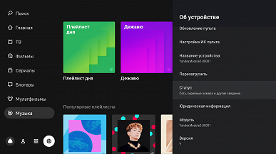 В небольшой менюшке, которая размещается в левом нижнем углу экрана слева направо: кнопка вызова «Алисы», меню управления учетными записями, каталог доступных приложений и раздел системных настроек. Весь основной контент главного меню подгружается из сервисов «КиноПоиск», «Яндекс.Музыка» и «Яндекс.Эфир».